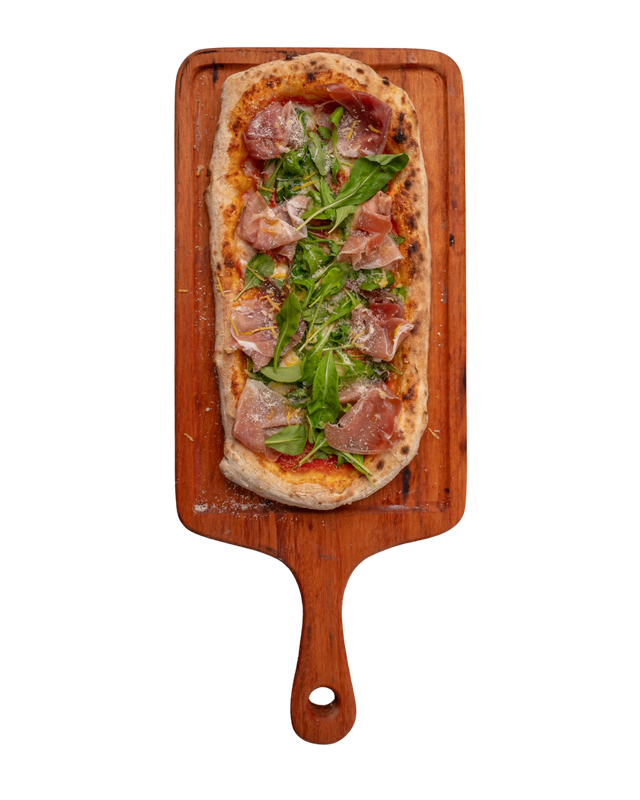 Massa de pizza aberta com as mãos em formato retangular, como se fazia há 2000 anos, com nostro molho de tomates pelados cultivados aos pés do Vesuvio em Napole, ricota, mozzarella de Búfala e azeite, finalizada com presunto parma, rúcula selvática e raspas de limão siciliano.