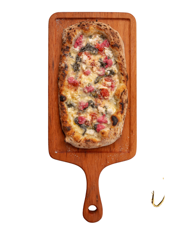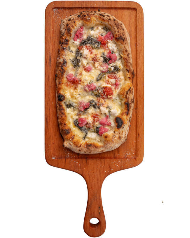 Massa de pizza aberta com as mãos em formato retangular, como se fazia há 2000 anos, Ricota, mozzarella, brócolis napoletano (friariello), linguiça fresca artesanal, parmesão 12 meses de cura, basilicão fresco e gotas do nostro molho de tomates pelados cultivados aos pés do Vesuvio em Napole.