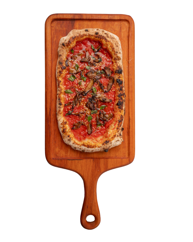 Massa de pizza aberta com as mãos em formato retangular, como se fazia há 2000 anos, com nostro molho de tomate, mix de cogumelos salteados no azeite, manjericão e gergelim.