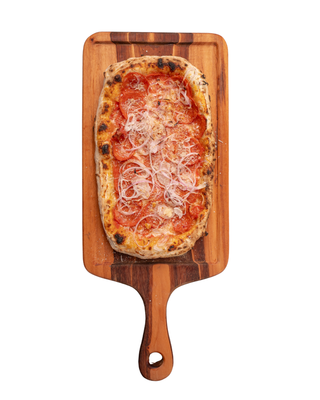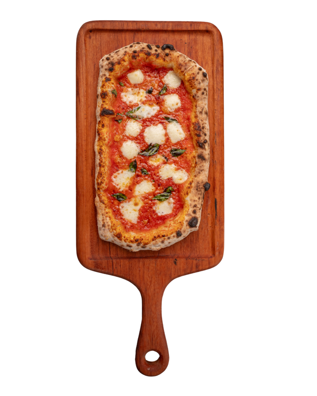 Massa de pizza aberta com as mãos em formato retangular, como se fazia há 2000 anos, com nostro molho de tomates pelados cultivados aos pés do Vesuvio em Napole, mozzarella de búfala, parmesão 12 meses de cura, azeite extra virgem e basilicão fresco.