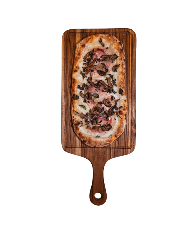Massa de pizza aberta com as mãos em formato retangular, como se fazia há 2000 anos, Mozzarella de búfala, panceta, mix de cogumelos, manjericão fresco e finalizada com azeite de trufas brancas.