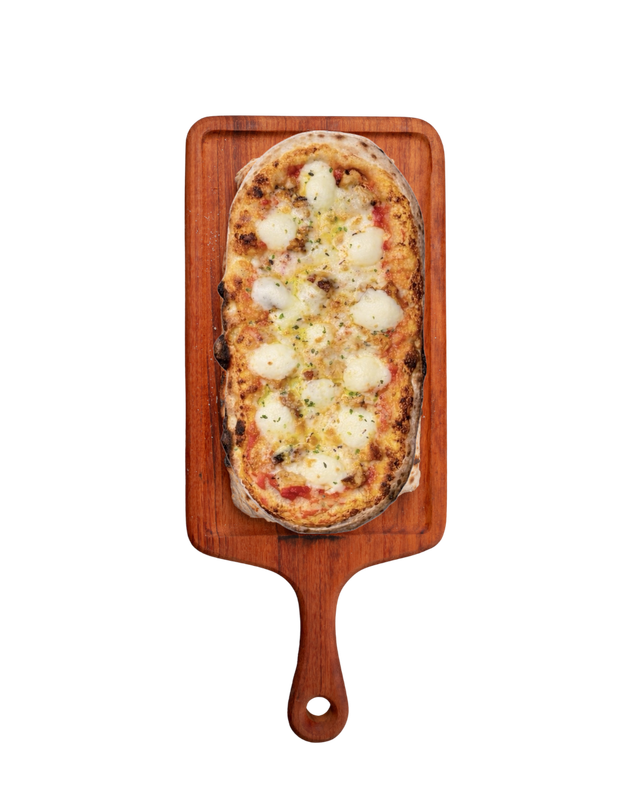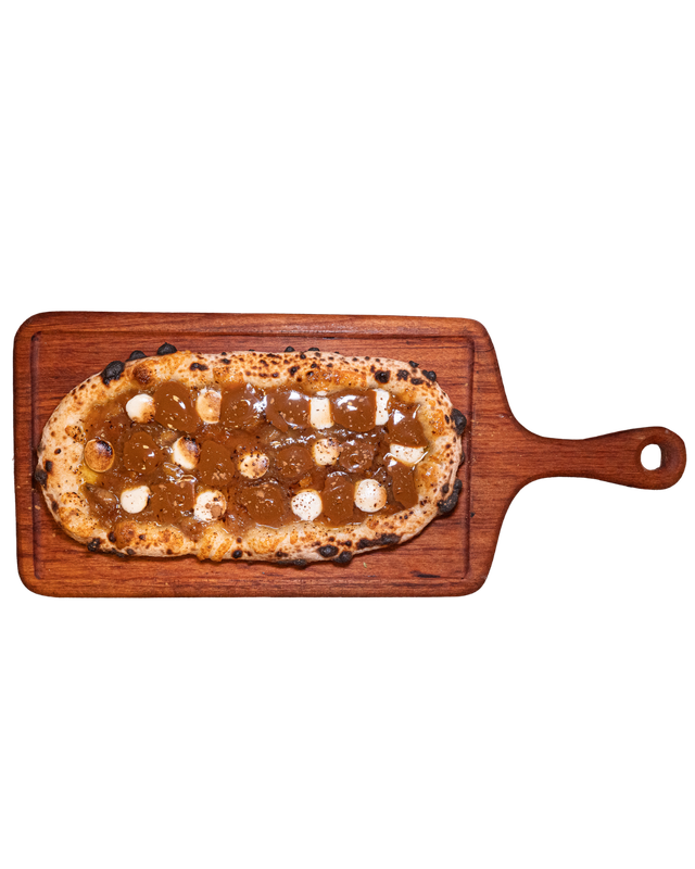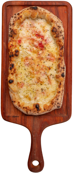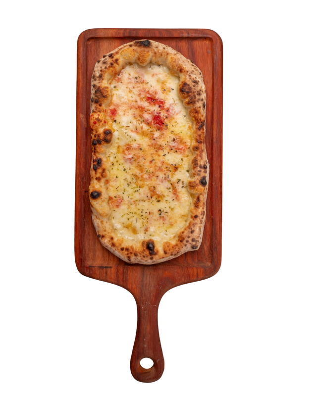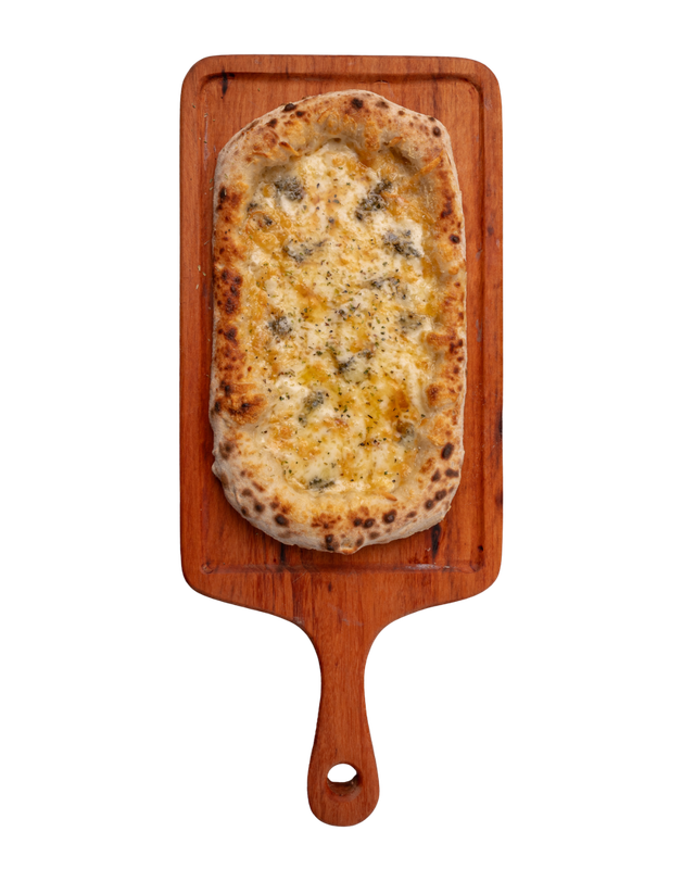 Nostra massa de pizza recheada com mozzarella, provolone, gorgonzola e parmesão 12 meses de cura, finalizada com um fio de melado e orégano.