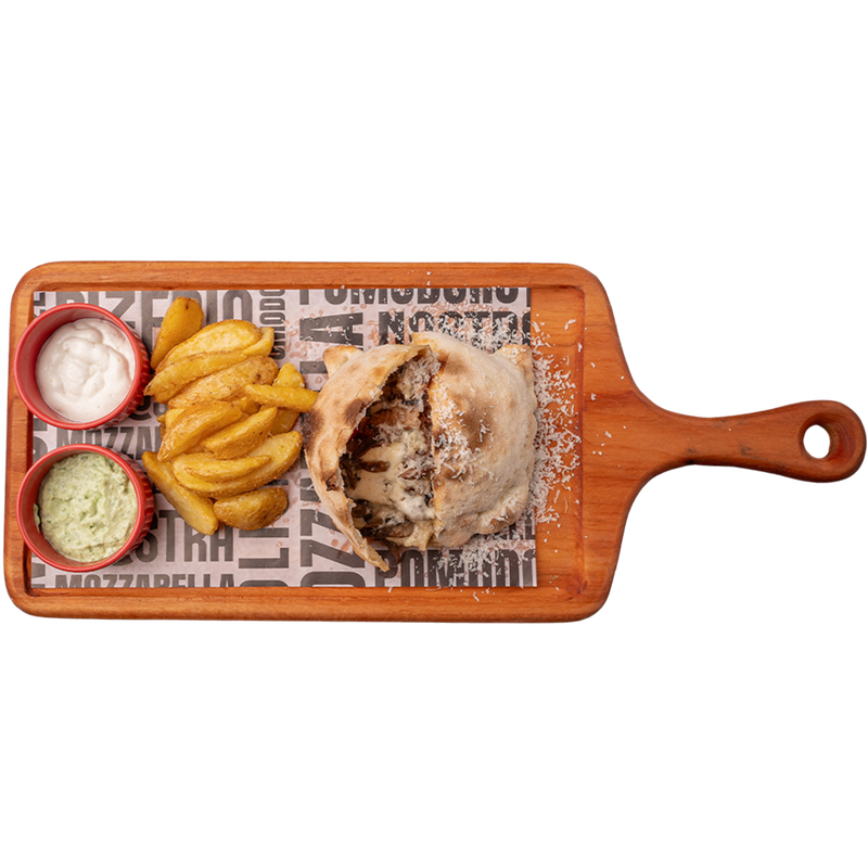 Burger suculento com queijo derretido e assado no forno dentro da nostra massa de pizza, servidos com batata rústica temperada ao nostro modo e aioli.