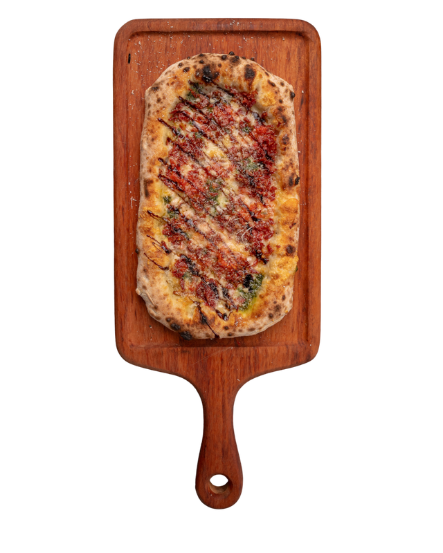 Massa de pizza aberta com as mãos em formato retangular, como se fazia há 2000 anos, Mozzarella, provolone, salame diavoletto, parmesão 12 meses de cura, gotas de pesto e nostro molho de tomates pelados cultivados aos pés do Vesuvio em Napole, finalizada com crema de balsâmico de Modena e mel.
