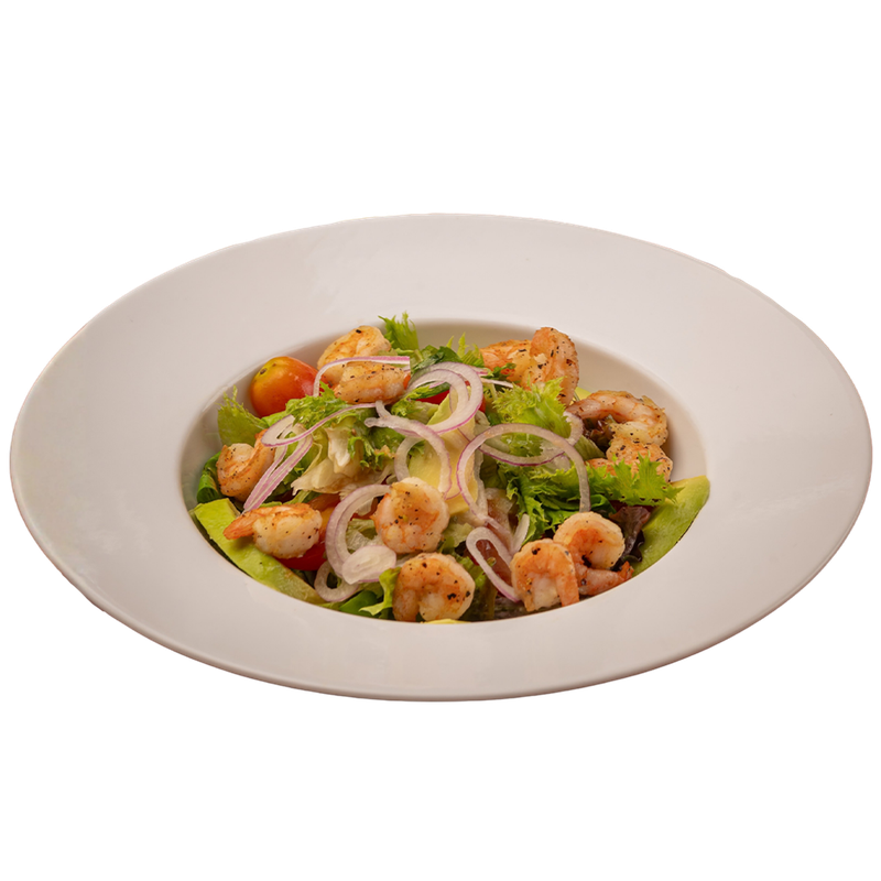 Mix de folhas frescas, camarões grelhados, abacate, tomate cereja e cebola roxa, temperados com azeite, balsâmico e especiarias.