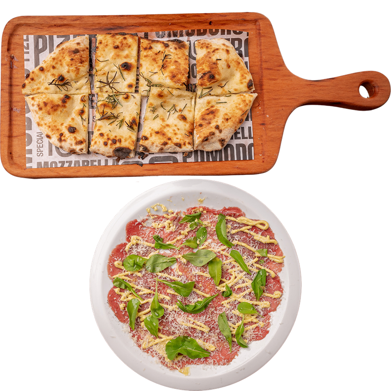 Finas lâminas de baby beef com rúcula fresca, parmesão, azeite extravirgem e nostro molho preparado com mostardas, alcaparras e um toque de limão, acompanhado de um pão feito com a nostra massa de pizza.