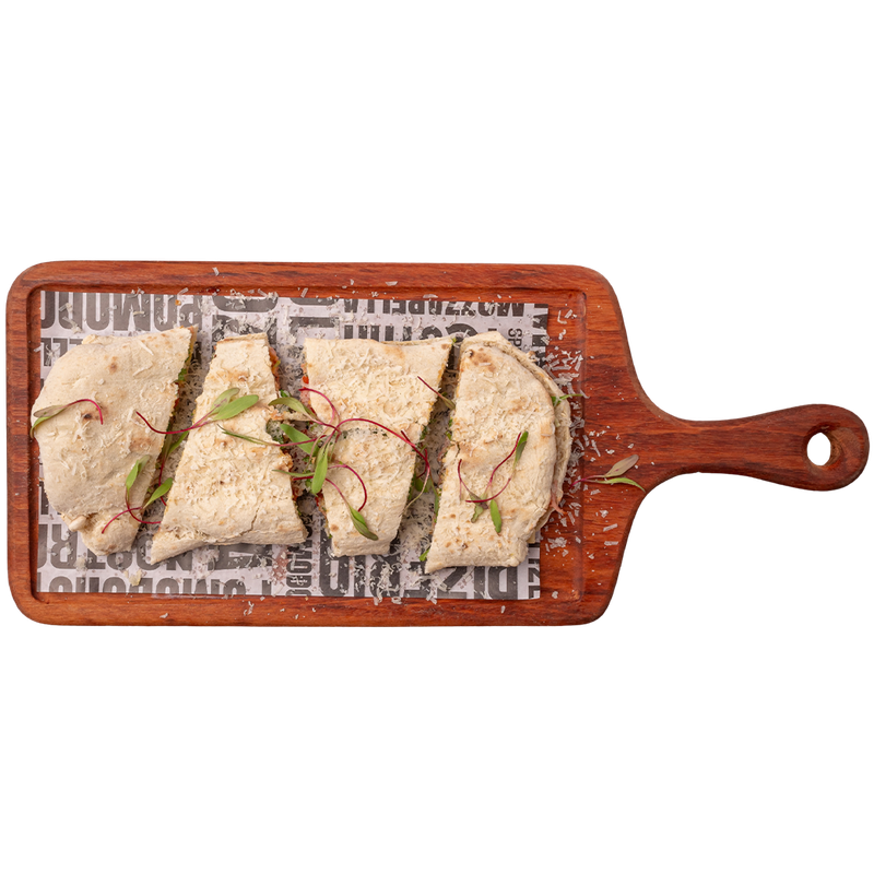 Nostra massa de pizza assada de forma especial, recheada com creme de alcachofra, tomate confit, mortadela italiana original com pistache, finalizada com pistache picado, brotos, azeite e parmesão. Servida em formato de meia lua.