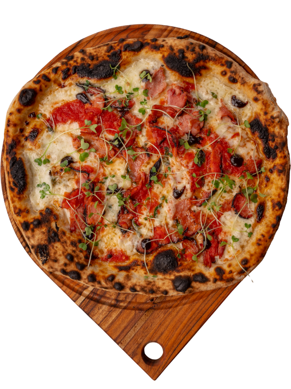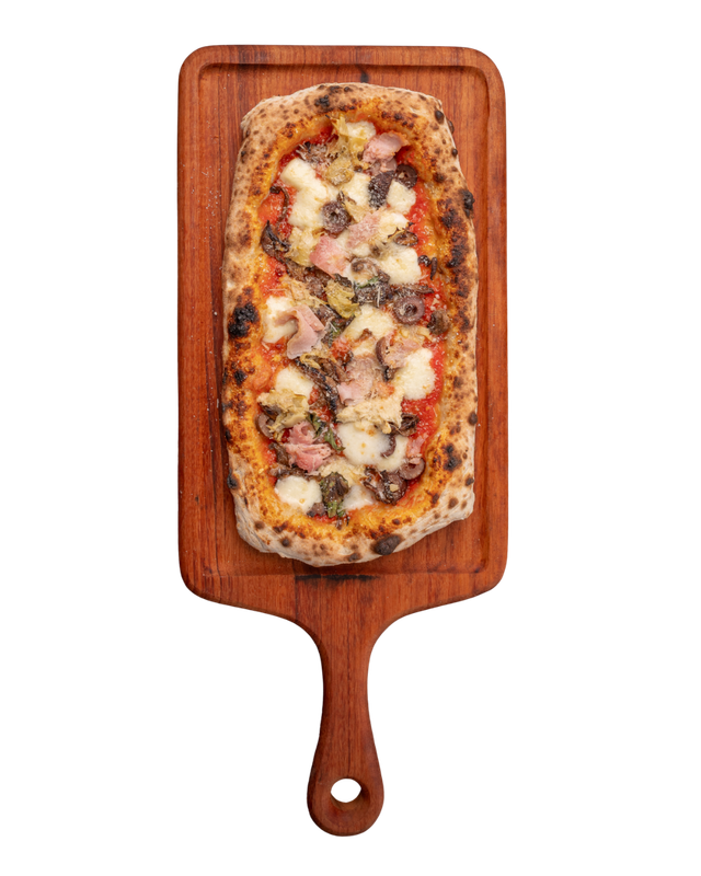 Massa de pizza aberta com as mãos em formato retangular, como se fazia há 2000 anos, com nostro molho de tomates pelados cultivados aos pés do Vesuvio em Napole, mozzarella de búfala, presunto Royale, alcachofras, funghi porcini, azeitonas pretas, parmesão 12 meses de cura e basilicão fresco.