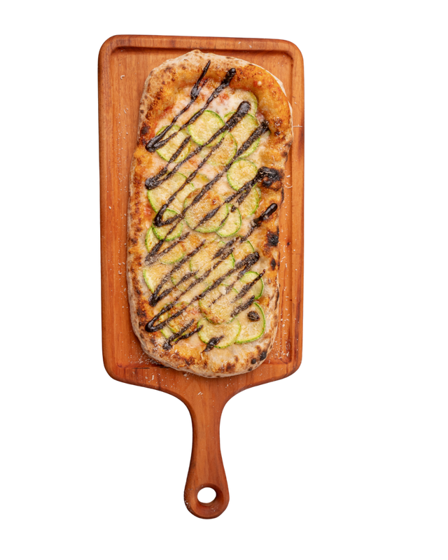 Massa de pizza aberta com as mãos em formato retangular, como se fazia há 2000 anos, com nostro molho de tomates pelados cultivados aos pés do Vesuvio em Napole, mozzarella, provolone, abobrinha fatiada, azeite e parmesão 12 meses de cura, finalizada com geleia de alho negro e parmesão ralado na hora.