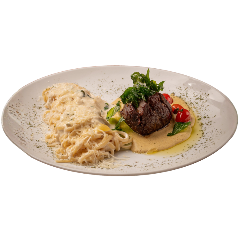 Burger suculento com stracciatella cremosa, mix de cogumelos salteados, queijo minas padrão derretido e toque de tomate confit, assado no forno dentro da nostra massa de pizza. Acompanha batata rústica temperada ao nostro modo e aioli.
