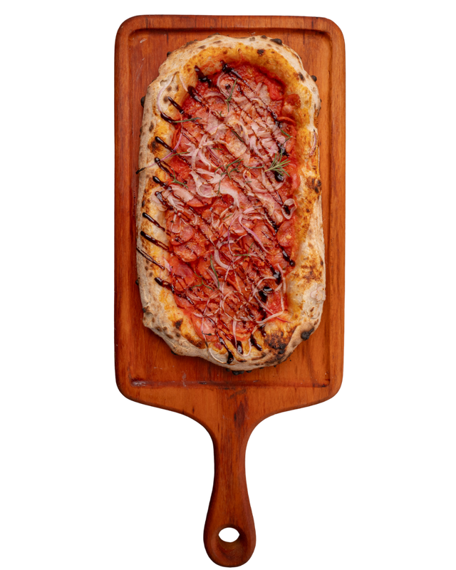 Massa de pizza aberta com as mãos em formato retangular, como se fazia há 2000 anos, com nostro molho de tomates pelados cultivados aos pés do Vesuvio em Napole, calabresa artesanal, alecrim, cebola roxa, parmesão 12 meses de cura e finalizada com crema de balsâmico de Modena.