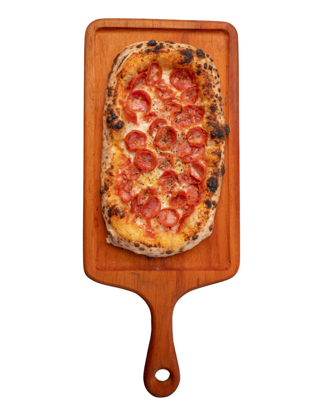 Massa de pizza aberta com as mãos em formato retangular, como se fazia há 2000 anos, com nostro molho de tomates pelados cultivados aos pés do Vesuvio em Napole, mozzarella e calabresa artesanal. Nostra homenagem a pizzaria mais antiga da América Latina, fundada em 1924.