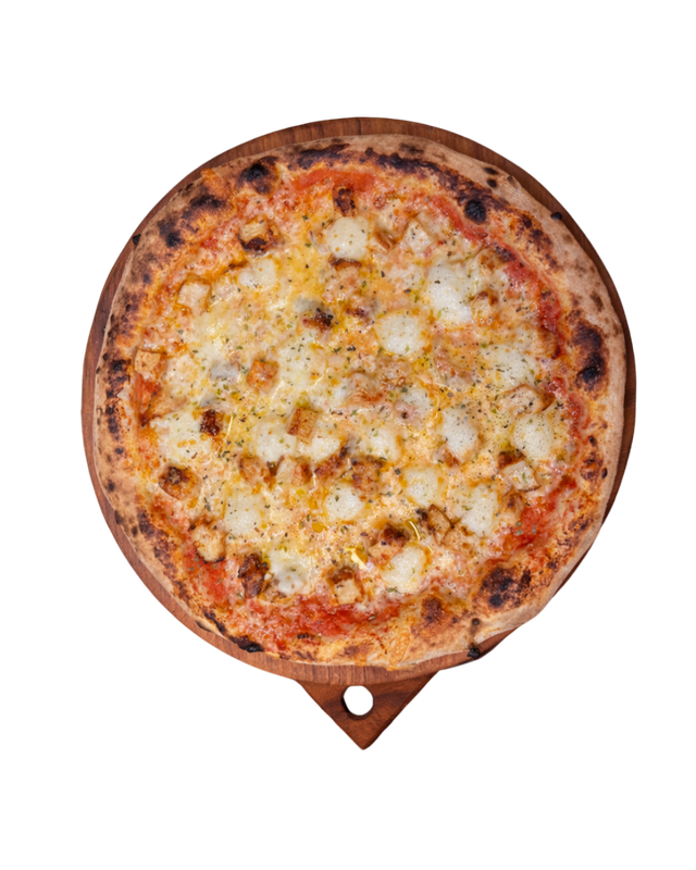 Massa de pizza aberta com as mãos em formato retangular, como se fazia há 2000 anos, com nostro molho de tomates pelados cultivados aos pés do Vesuvio em Napole, mozzarella, peito de frango em cubos, gotas de catupiry e finalizada com orégano.