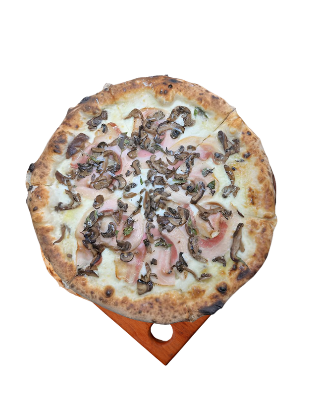 Mozzarella de búfala, panceta, mix de cogumelos, manjericão fresco e finalizada com azeite de trufas brancas.